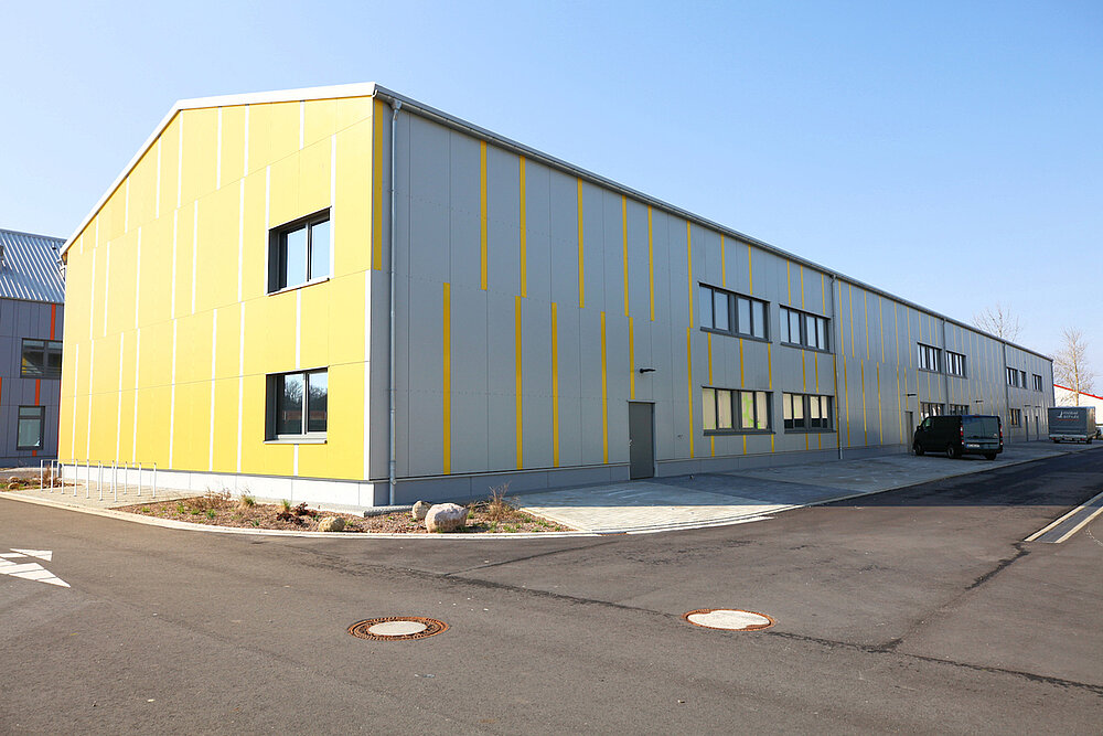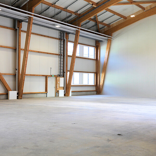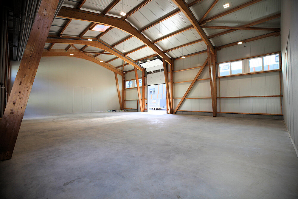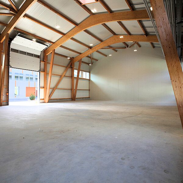 Die Flächen sind so gestaltet, dass interessierte Betriebe für ihr Unternehmen ideale Bedingungen zur individuellen Gestaltung vorfinden. Im Ergebnis sorgt der modulare Aufbau für Lösungen, die den Vorstellungen der Mieter entsprechen. Trennwände zur Bildung von Abtrennungen für Lager/Sozialraum/Büro können nach Wunsch eingesetzt werden; gern erstellen wir hierzu ein Angebot. Die Hallen wurden freitragend ausgeführt und haben eine Höhe von neun Metern. Seitenlichtbänder sind vorhanden und sorgen für natürliches Tageslicht.